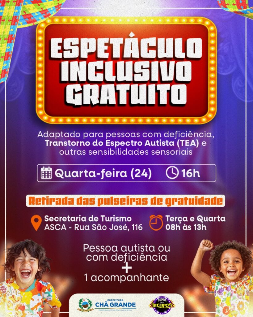 O Super Circo Íncaros, que estreou em Chã Grande na última sexta-feira (19), terá uma apresentação inclusiva na cidade nesta quarta-feira (24), a partir das 16h. A iniciativa faz parte de uma parceria entre o circo e a Prefeitura Municipal, e tem como objetivo garantir também que crianças com deficiência, Transtornos do Espectro Autista (TEA) ou outras sensibilidades sensoriais possam acompanhar o espetáculo de forma saudável.