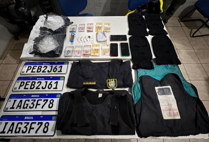 Durante a revista, os policiais encontraram 20 pedras de crack, uma “dola” de maconha, além de R$ 433 em espécie. Também foram apreendidos diversos materiais que, segundo a polícia, podem estar relacionados à atividade criminosa, incluindo balaclavas, caderneta com anotações de possíveis negociações do tráfico, mais de 1.500 microtubos plásticos utilizados para acondicionar cocaína, além de placas e capas de coletes balísticos, três aparelhos celulares e quatro placas de veículos.