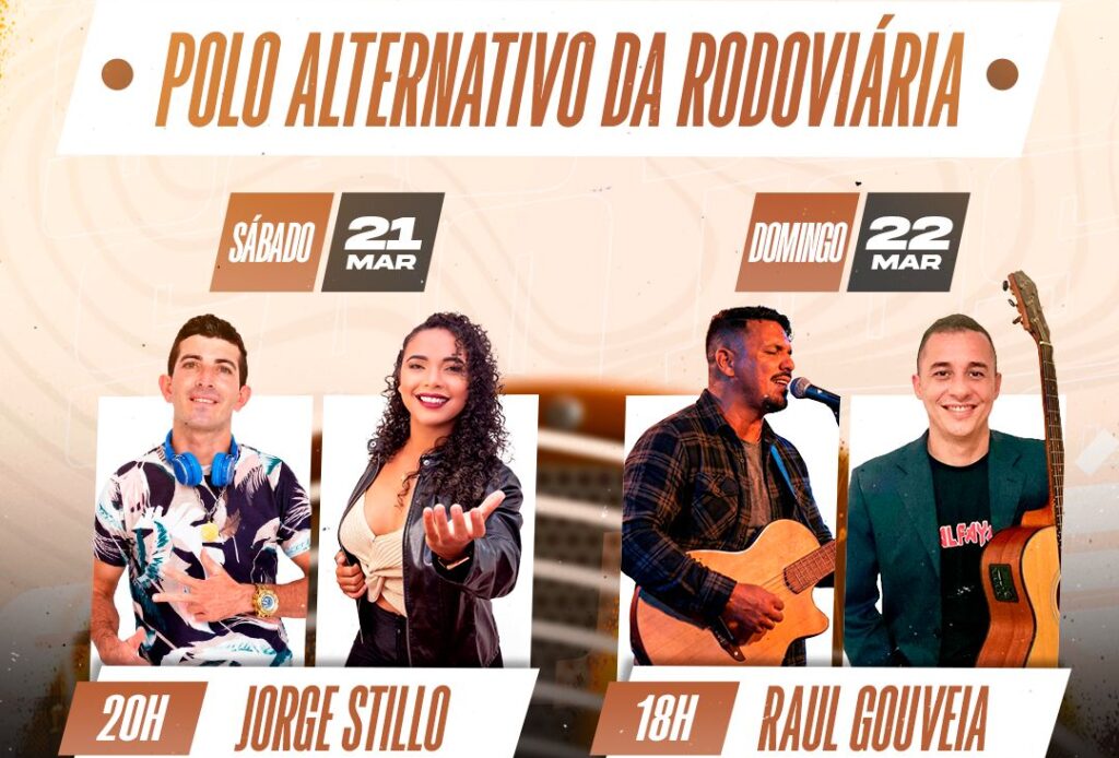 A programação no Polo Alternativo da Rodoviária começa no sábado (21), a partir das 20h. A primeira atração a se apresentar é o artista Jorge Stillo. Em seguida, a partir das 22h, o público vai curtir o show de Aline Bernardo.