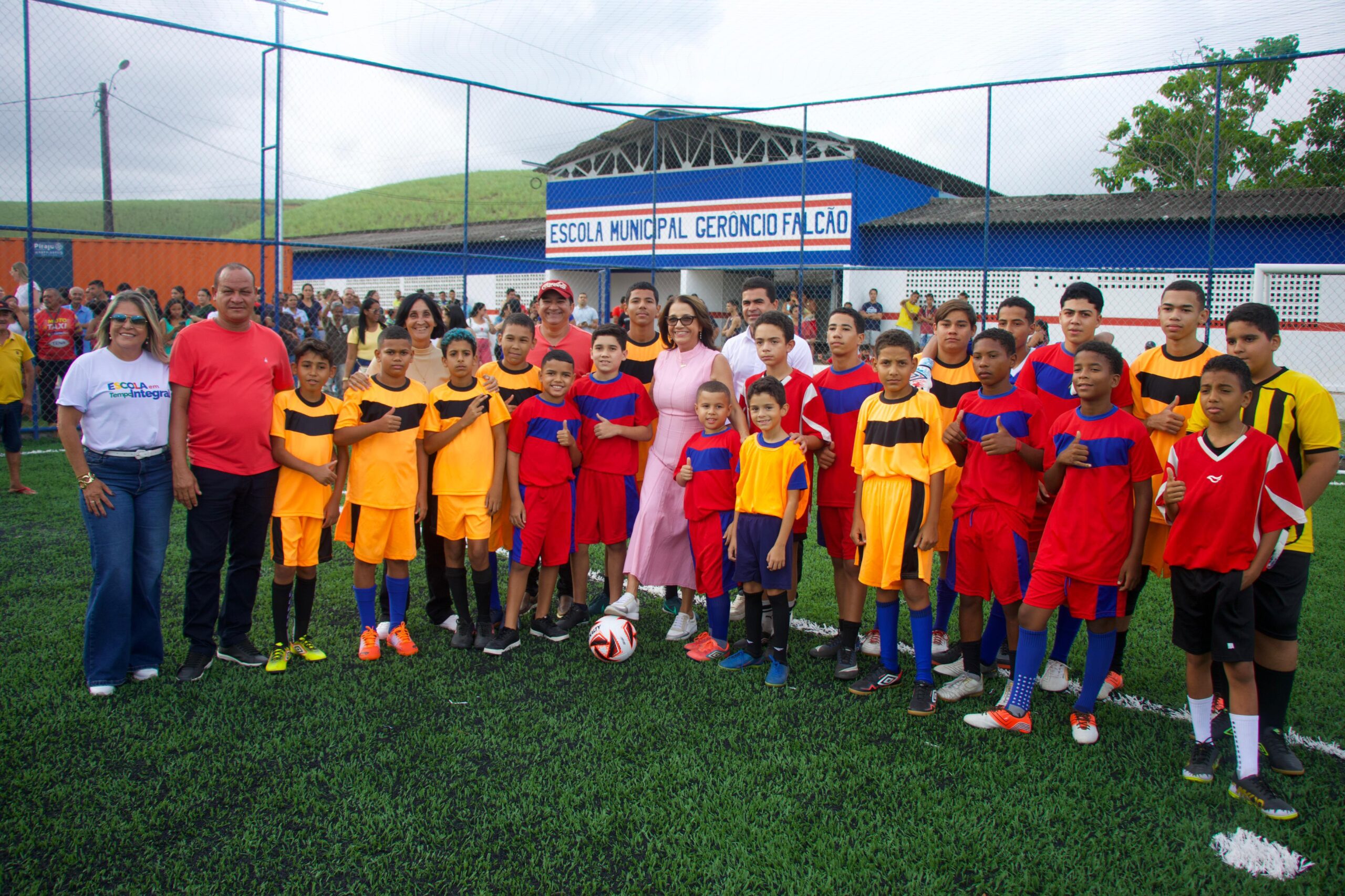 A Prefeitura da Escada inaugurou, nesta terça-feira (20), o novo Campo Society da Escola Municipal Gerôncio Falcão, situada no bairro da Pracinha. A obra representa mais um investimento da gestão municipal na promoção do esporte, do lazer e da integração comunitária, beneficiando diretamente moradores dos bairros Pracinha, Vale Verde e Alto do Sacrifício, além de toda a população escadense.